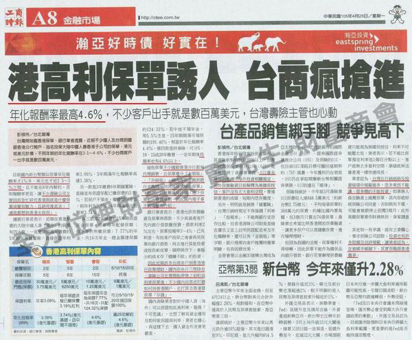 近期看到了一篇報導『港高利保單誘人,台商瘋搶進』,香港保單因為年期短,報酬高,受到許多名眾的青睞,讓兩岸四地的客戶都爭相前往香港搶購。我們就來看看這篇報導的內容
