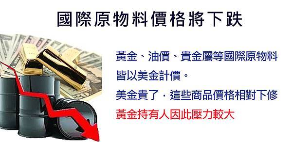 美元強升後,將導致以美元計價的大宗商品蒙上陰影,包括原物料、礦產、金屬、能源價格未來走勢恐受壓抑。且市場資金可能從避險性質較高的黃金,轉向美元,黃金價格有可能進一步走跌。