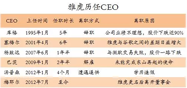 雅虎 22 年換了 7 任 CEO,最長的任期 6 年,短的僅 4 個月就被董事會趕下台。