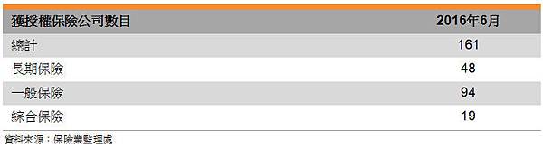 截至2016年6月底,香港共有161家獲授權保險公司,其中約半數在海外註冊成立。在海外註冊的保險公司中,百慕達、美國和英國公司數目居於前列。