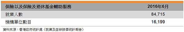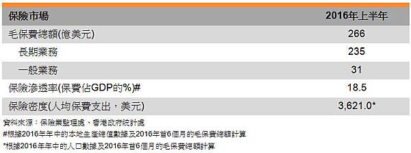 根據保險業監理處報告,2016年上半年,香港保險業的毛保費總額按年增加14.0%,至2,075億港元(266億美元),相當於香港本地生產總值(GDP)18.5%。一般保險業務增長0.6%,至240億港元(31億美元)。同期,生效中的長期保險業務按年增長14%,至1,835億港元(235億美元),新造長期保險業務的按年增幅更高,達18.9%,總值817億港元(105億美元)。長期保險業務佔毛保費總額88%,其餘12%為一般保險業務。