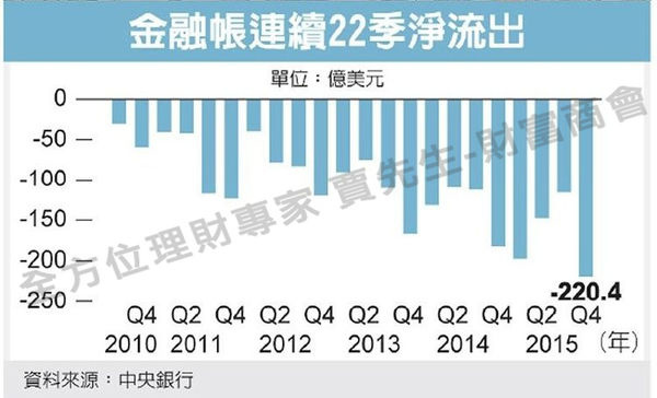 金融帳主要包括直接投資、證券投資、其他投資等,2015年第4季其他投資淨流出46.8億美元,成為金融帳淨流出突破200億美元大關的重要推手;央行官員說,主因銀行預期美國升息及美元升值,償還國外同業及聯行的短期借款。