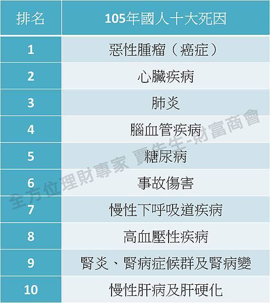 105年國人十大死因,總計去年死亡人數17萬2,418人,較前年增加5.4%,比過去10年平均年增2.5%高出許多,研判主要是人口老化,去年死於肺炎的人數共計1萬2212人,9成為65歲以上長者,相較前年增加13.5%。另外,癌症從71年起,已第35年蟬聯國人十大死因之首,其中男性死亡人數10萬2985人,是女性死亡人數6萬9433人的1.5倍。