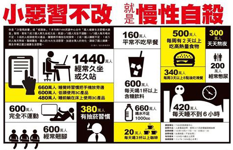 喝酒、熬夜、抽菸、不運動、暴飲暴食、過度使用手機….