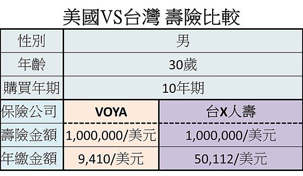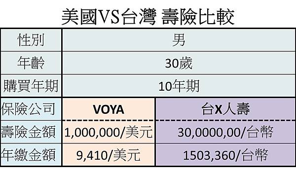 賈先生簡單做了比較表,其實是差異很大的,但因台灣目前壽險較少有美元形式的,所以拿台X人壽的台幣來做比較!!!(歡迎大家分享你認為最強的壽險出來比較)